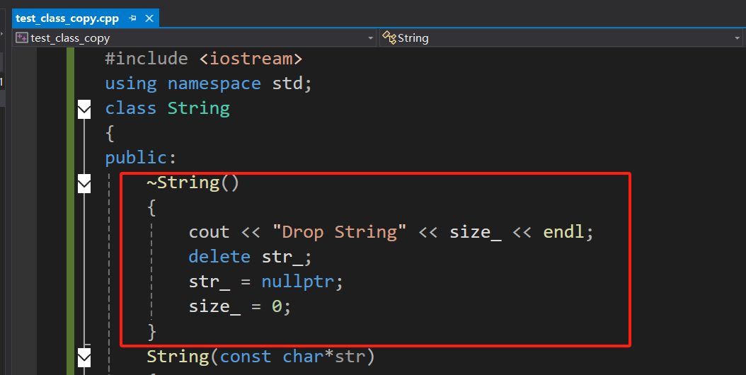 当 main 函数结束时,str1 被销毁,再次触发析构函数,输出 "Drop String..."。