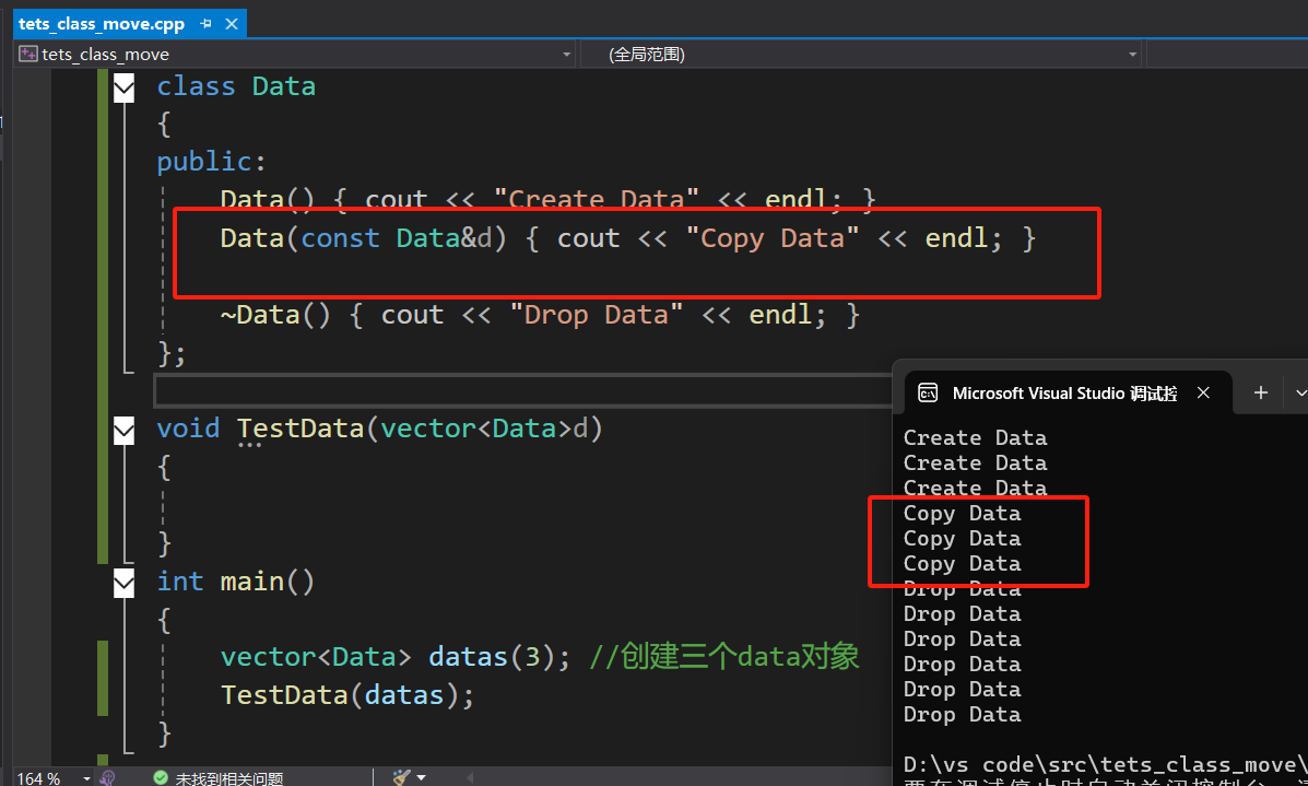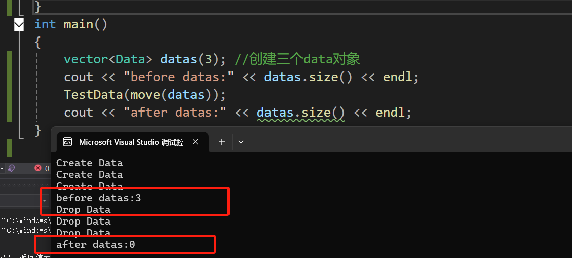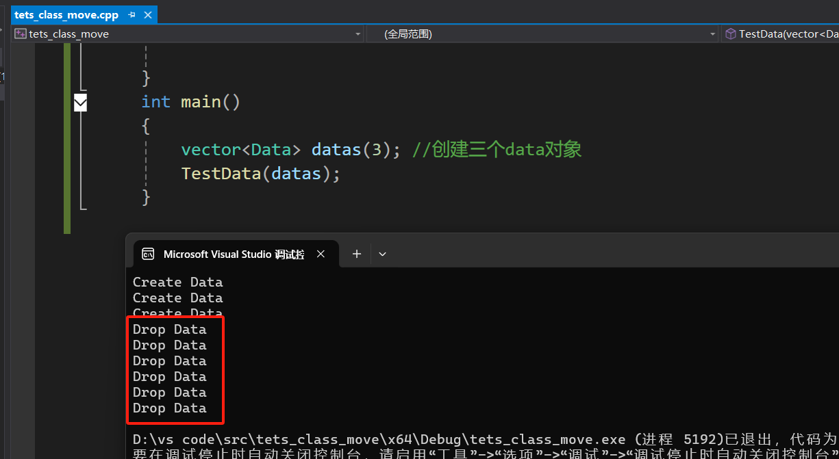 当 TestData 函数结束时,d 的生命周期结束,会调用 vector 的析构函数,从而销毁其内部的 Data 对象。接着,在 main 函数中,datas 的生命周期结束时,又会再次销毁 datas 中的 Data 对象。这会导致 Data 的析构函数被调用两次(每个对象两次),从而可能引发重复释放资源的问题(尽管在这个例子中不会崩溃,因为 Data 没有管理动态分配的资源)。