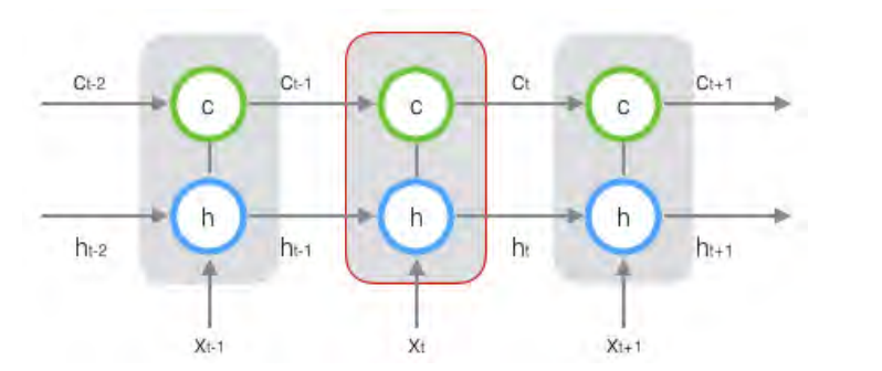 我们可以看出,在 \(t\) 时刻,LSTM的输入有三个:当前时刻网络的输入值 \(x_t\) 、上一时刻LSTM的输出值 \(h_{t-1}\)、以及上一时刻的单元状态 \(c_{t-1}\) ;LSTM的输出有两个:当前时刻LSTM输出值 \(h_t\) 、和当前时刻的单元状态 \(c_t\) 。注意 \(x\)、\(h\) 、\(c\) 都是向量。