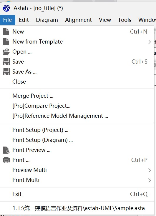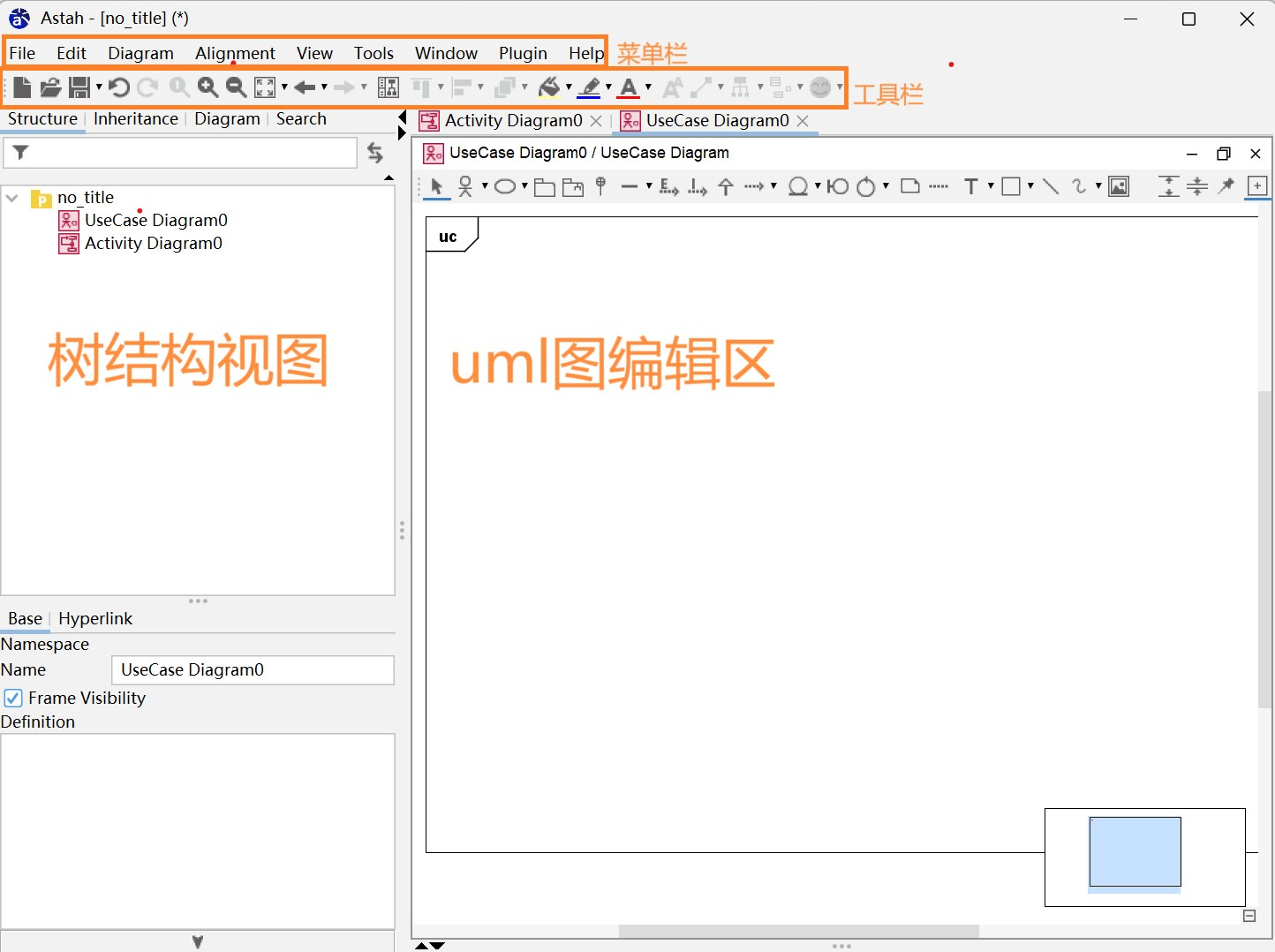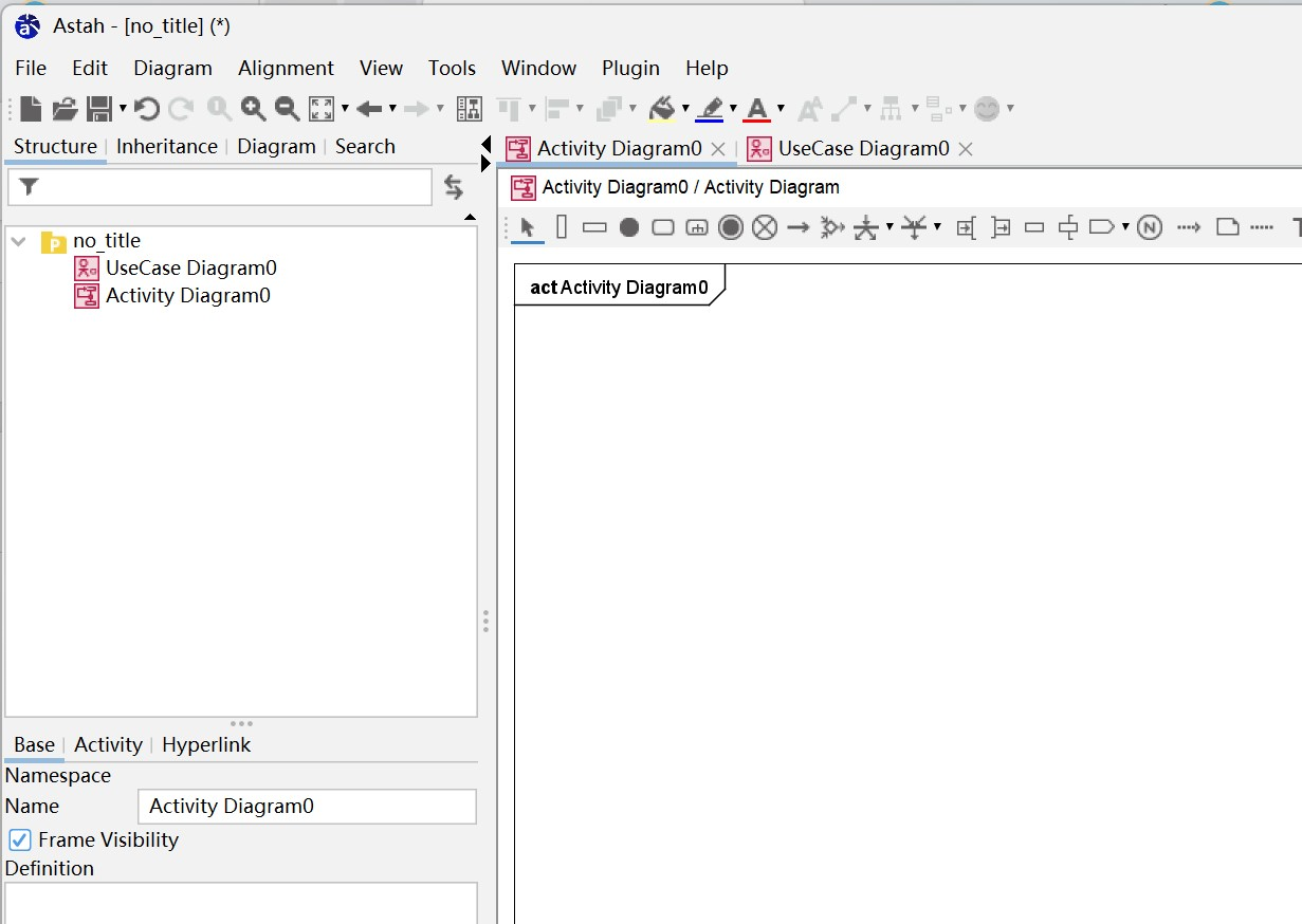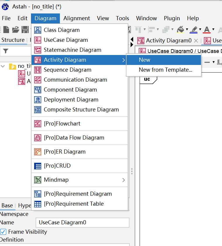 然后,选择菜单中的[Diagram],选择子菜单选择子菜单,就可以创建对应的UML图;(此处我以用例图为例,选择[Activity Diagram],绘制UML用例图。)