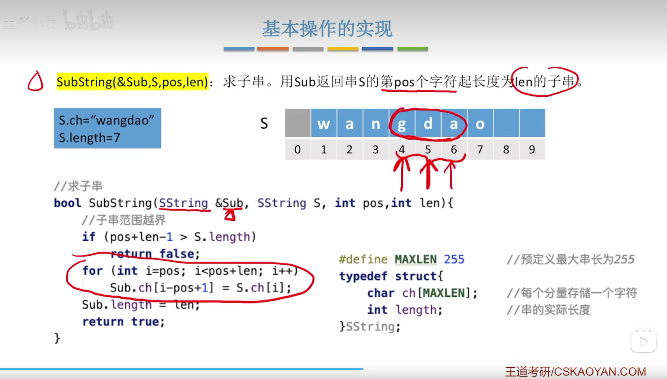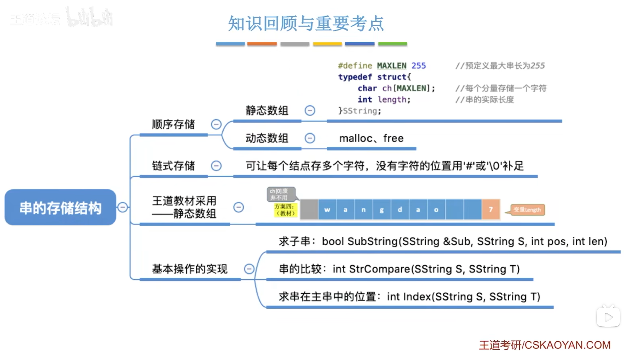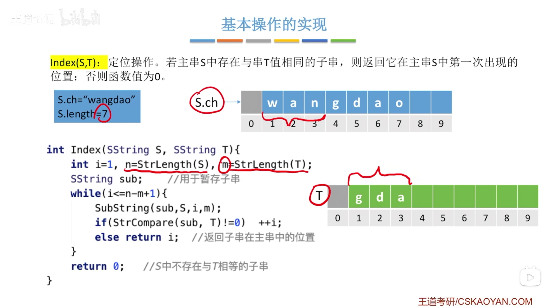 这一章,王道选择空出下标为零的数组,后面的函数设计也都基于此。(这样可以使字符的位置与数组的下标统一