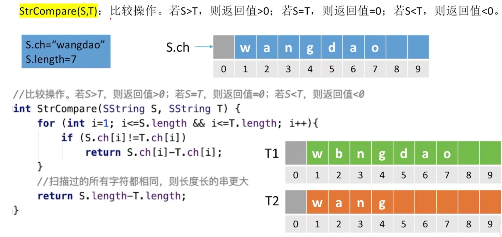 如果循环结束后,都没有出现字符不相等的情况,说明两个字符串前面的字符都相同。此时,根据注释 “扫描过的所有字符都相同,则长度长的串更大” ,函数返回S.length - T.length。若结果大于0,说明S的长度大于T,即S > T;若结果等于0,说明两个字符串长度相等且字符都相同,即S = T;若结果小于0,说明S的长度小于T,即S < T。