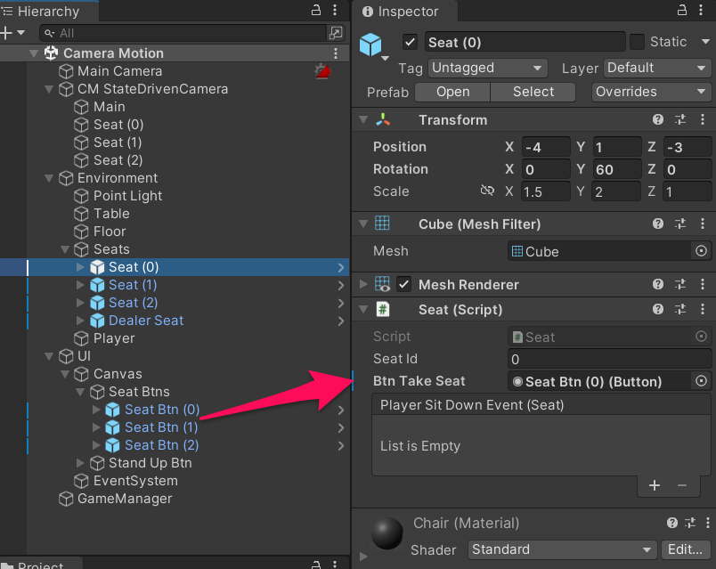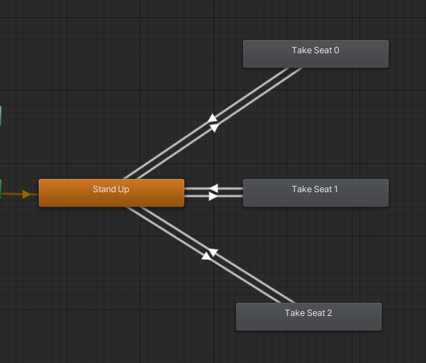 - 设置Player Animator和State(Stand up、Sit Down 0/1/2),状态迁移可以简单的通过Seat Id equals xxx来实现(Stand up处seat id = -1)