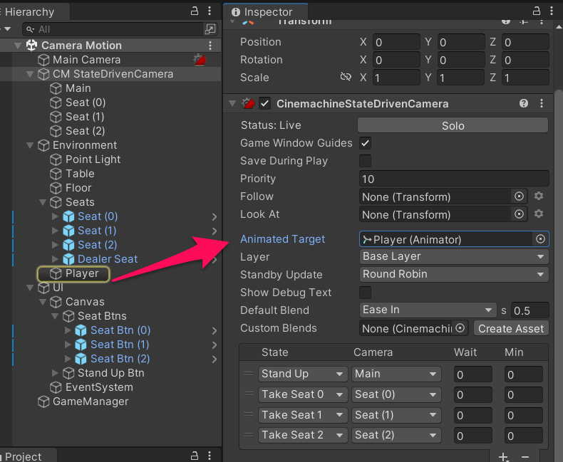 为Player State Animator设置 States 和 Transitions, Take Seat 0/1/2分别代表玩家选中了该处座位