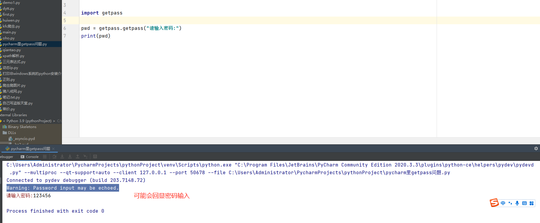 pycharm这么强大,不可能制作者没有发现,于是我发现了直接点右上角运行旁边的小虫子可以执行出结果,这个回显密码输入让我有些奇怪,可能pycharm就是为了隐私所以故意让getpass不显示出来