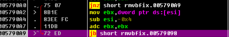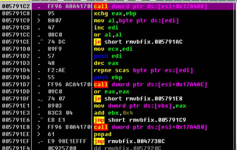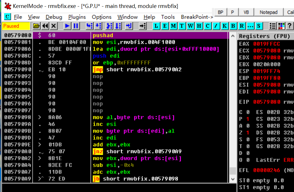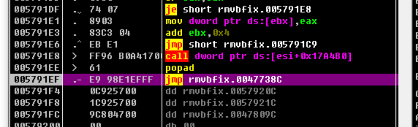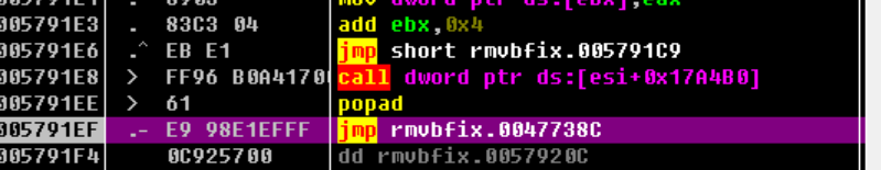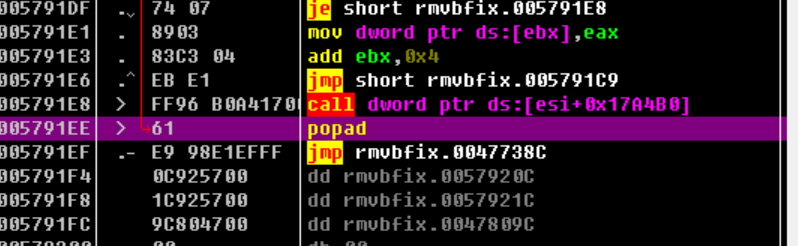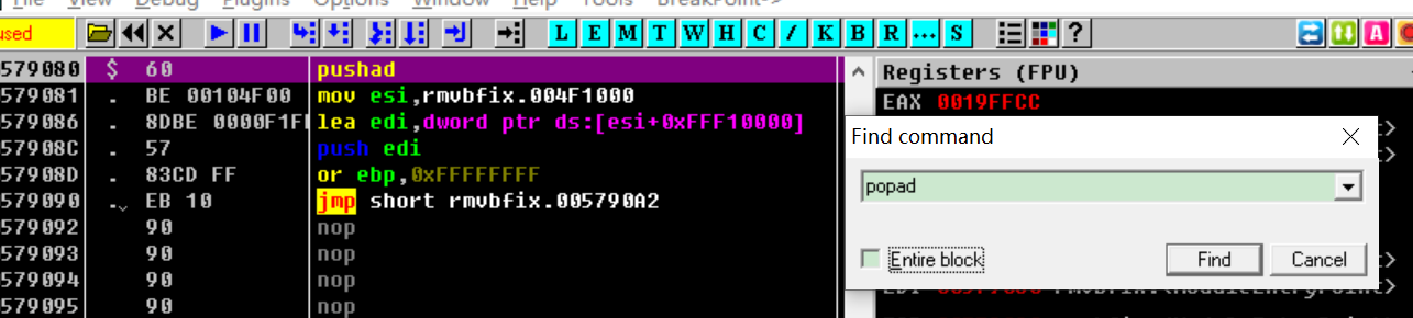 由于第一条是pushad,所以一定有一条popad与之对应,我们这里直接查找popad