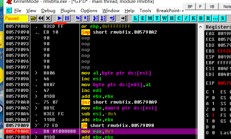 这里我们可以看到执行的该条语句为向上跳转,此时我们可以在该条语句的下一句处设下断点,然后点击运行按钮,即可直接到达,而不需要在向上跳转