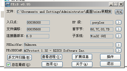 什么也没有发现,但是在EP段里我们发现了.perplex,这就表明他是一个ACProtect132壳,我们用OD载入