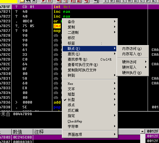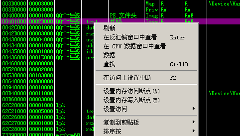 选择数据窗口中跟随,然后右键选择内存访问断点