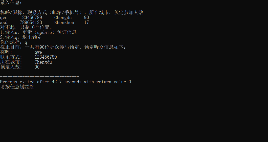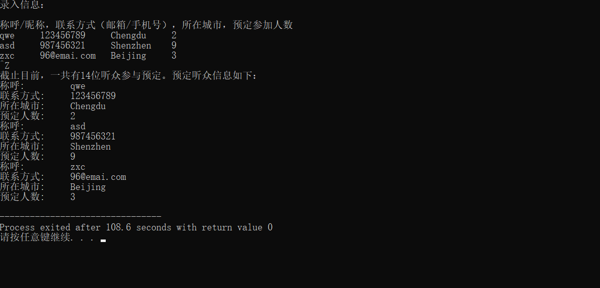 #include "Info.hpp" #include <iostream> #include <string> #include <vector> using namespace std; int main() { vector<Info>audience_info_list; const int capacity=100; string x,y,z; int count=0,n; char choice; cout<<"录入信息:"<<endl<<endl; cout<<"称呼/昵称,联系方式(邮箱/手机号),所在城市,预定参加人数" <<endl; while(cin>>x) { cin>>y; cin>>z; cin>>n; if(n+count>capacity) { cout<<"对不起,只剩"<<(capacity-count)<<"个位置。"<<endl; cout<<"1.输入u,更新(update)预订信息"<<endl; cout<<"2.输入q,退出预定"<<endl; cout<<"你的选择:"; cin>>choice; if(choice=='u') { cout<<"称呼/昵称,联系方式(邮箱/手机号),所在城市,预定参加人数"<<endl; continue; } else break; } else { count+=n; audience_info_list.push_back(Info(x,y,z,n)); } } cout<<"截止目前,一共有"<<count<<"位听众参与预定。预定听众信息如下:"<<endl; for (int i=0;i<audience_info_list.size();i++) audience_info_list[i].print(); return 0; }