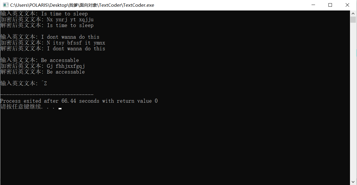 #include "TextCoder.hpp" #include <iostream> #include <string> int main() { using namespace std; string text, encoded_text, decoded_text; cout << "输入英文文本: "; while (getline(cin, text)) { encoded_text = TextCoder(text).encoder(); // 这里使用的是临时无名对象 cout << "加密后英文文本:\t" << encoded_text << endl; decoded_text = TextCoder(encoded_text).decoder(); // 这里使用的是临时无名对象 cout << "解密后英文文本:\t" << decoded_text << endl; cout << "\n输入英文文本: "; } }