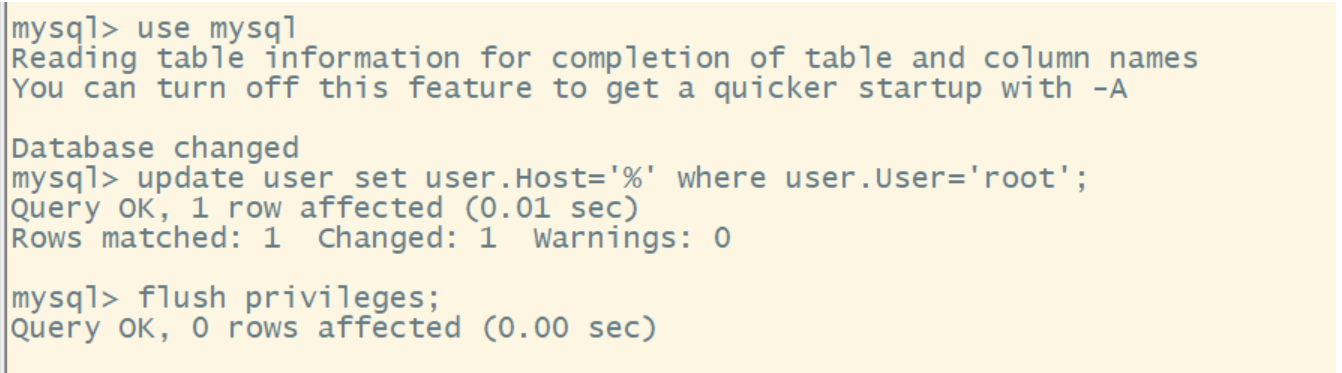 2、mysql> update user set user.Host='%' where user.User='root';