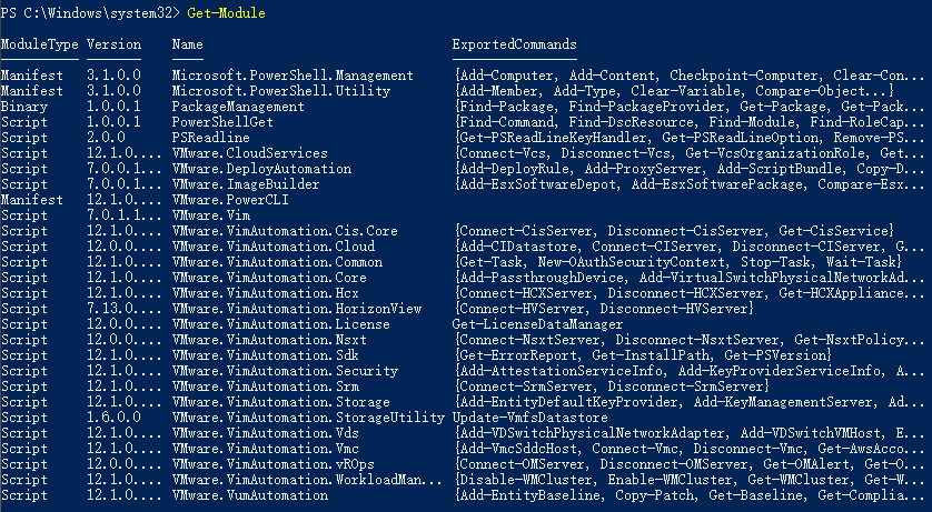 Get-Module #再次执行这个命令,就能看到VMware相关的一系列的模块了。