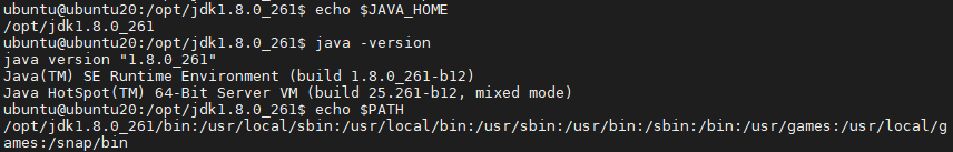 cd 桌面 # 定位到jdk压缩包所在的目录 sudo cp /home/ubuntu/jdk-8u261-linux-x64.tar.gz /opt # 把jdk复制到指定的jdk安装目录 cd /opt # 定位到指定的jdk安装目录 sudo tar -xzvf jdk-8u261-linux-x64.tar.gz # 解压缩jdk,得到文件夹jdk1.8.0_261