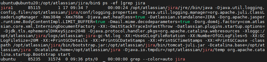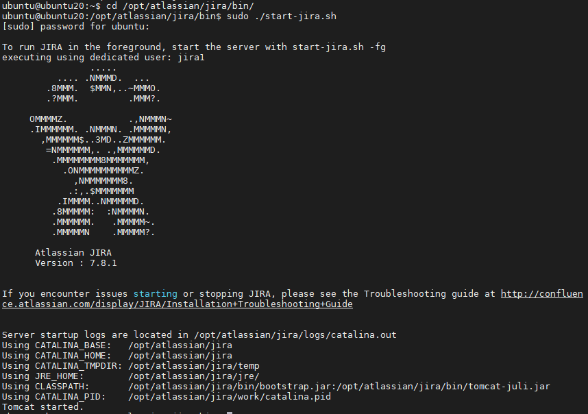 cd /opt/atlassian/jira/bin/ //跳转到jira目录 sudo ./start-jira.sh //运行jira