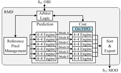 在实现层面上,RMD 的控制逻辑被划分为三个循环层次。第一级循环遍历不同的 PU 大小,第二级循环遍历每个 PU 内部的所有 4×4 块,这两个层次均采用串行方式执行;第三级循环则针对每个 4×4 块遍历其 33 种角度预测模式。为了满足吞吐率要求,RMD 在第三级循环中采用并行处理结构,利用 6 个并行的 4×4 引擎同时计算不同角度模式的预测代价。通过这种“外层串行、内层并行”的架构,系统既能保持较小的硬件面积,又能在高性能要求下实现足够的运算吞吐量。
