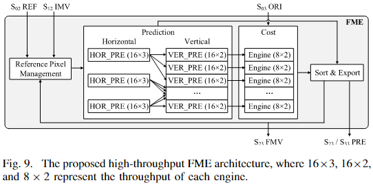 FME(Fractional Motion Estimation)硬件架构如图9所示,由四个主要模块组成:参考像素管理(RPM)、预测模块、代价模块和排序与导出模块。其核心处理流程如下:
