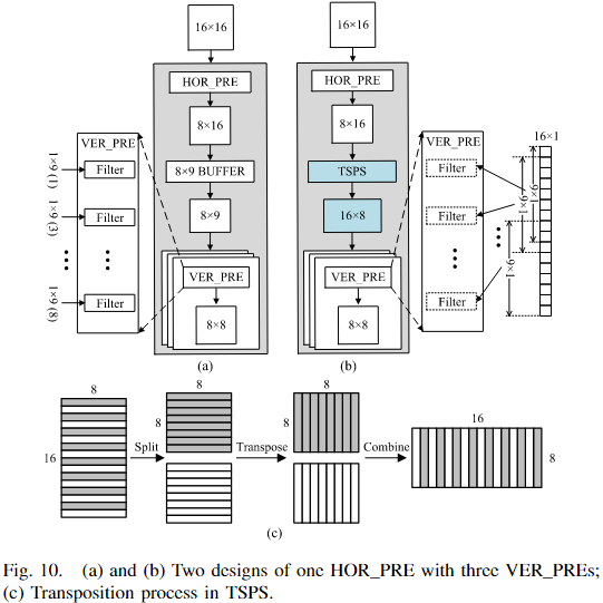 解决方案:采用 TSPS 缓存 HOR_PRE 输出的 8×16 块,然后顺序转置为 16×8 块并输出,使 VER_PRE 能够访问重叠输入,实现滤波器重用。