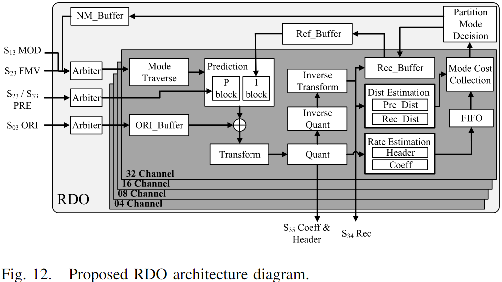 图12展示了用于 RDO 的完全并行硬件架构。由于不同 PU 大小之间的最小依赖性,设计采用四个通道(04/08/16/32)并行处理四种不同 PU 大小。
