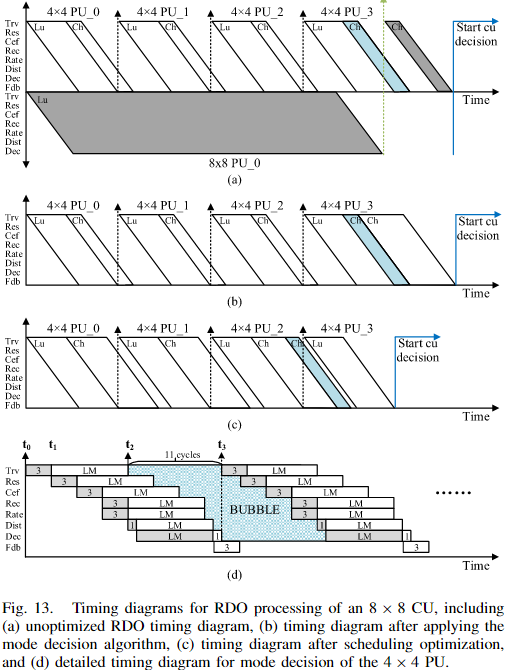 - 调度策略将 4×4 和 8×8 PU 的色度模式安排在前三个气泡中(图13c),充分利用空闲周期。
