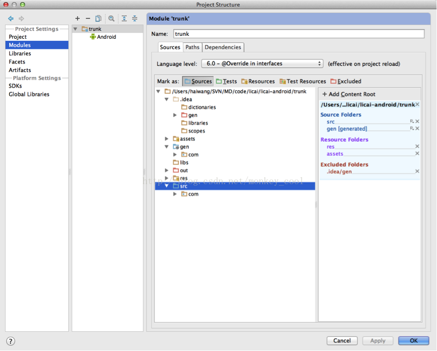 4.后续还会发现,出现一个R和BuildConfig重复的bug,这是因为android studio的idea里的gen和外层的gen冲突的问题,设置.idea文件夹里的gen文件夹mark sa excluded(排除)即可.
