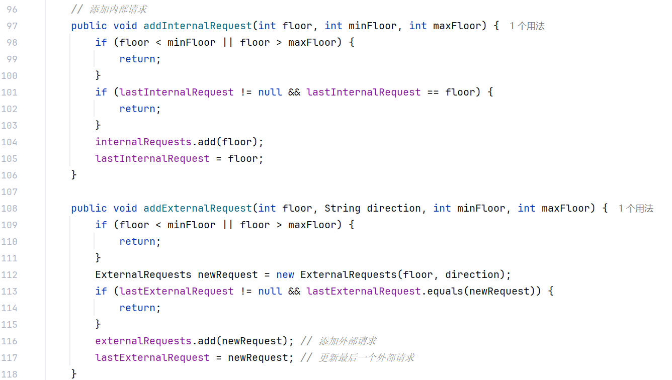 改进后:代码将内部请求和外部请求合并到一个 List 中,统一进行处理。通过计算所有请求楼层中的最高楼层和最低楼层,然后根据当前楼层与最高、最低楼层的关系来确定电梯的运行方向,使得逻辑更加简洁,减少了代码的复杂度,也提高了可读性。