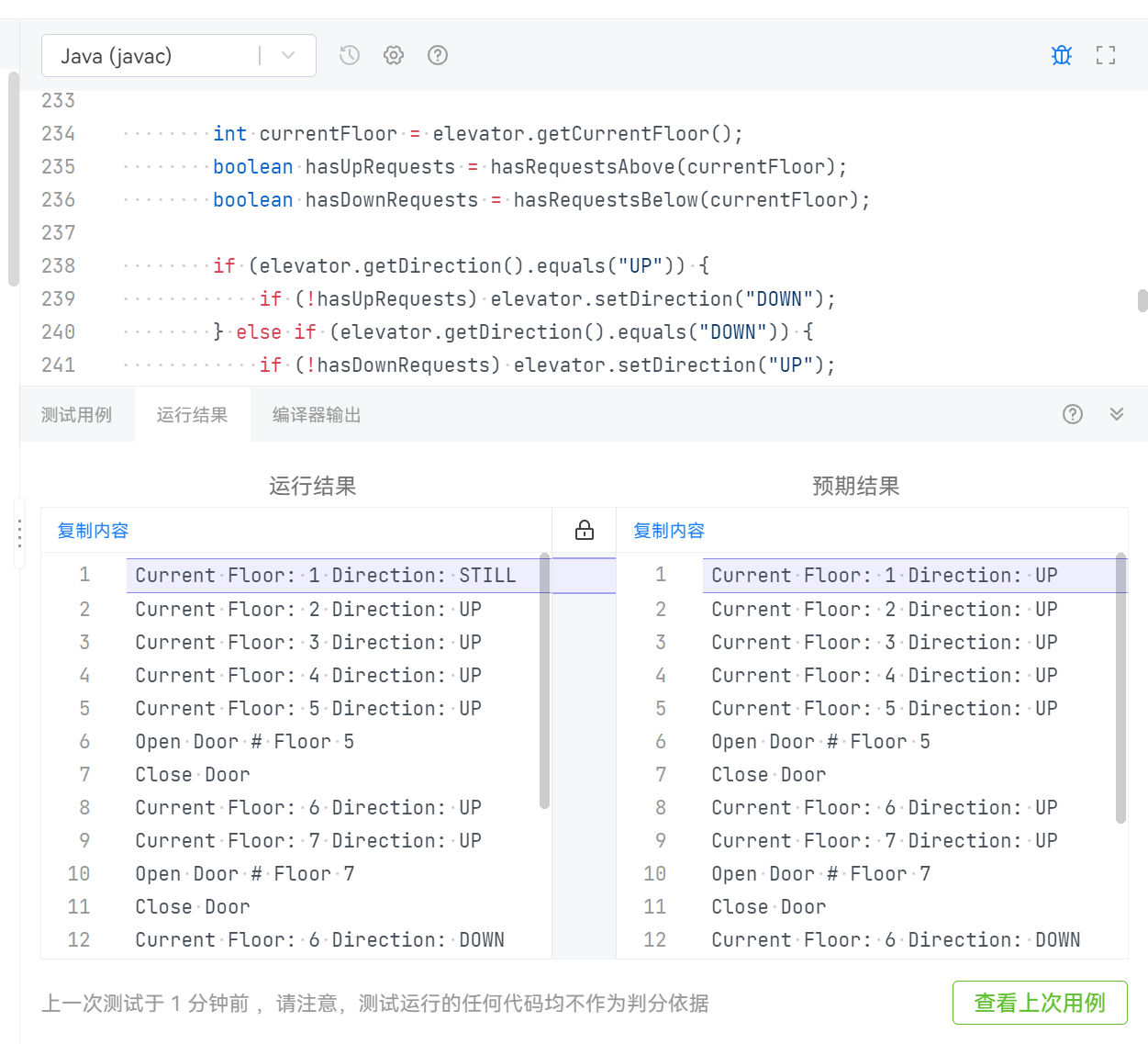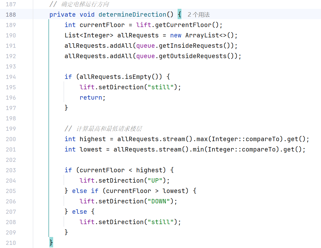 新增规则:Controller.determineDirection() 方法中,根据内部和外部请求的楼层与当前楼层的关系,动态切换电梯方向,就比如电梯向上时,如果所有请求楼层低于当前楼层,则切换为下行。但此处为处理所有可能遇到的情况,使用了多层嵌套,复杂度大大加深,因为代码过长,此处仅展示情况一和情况二