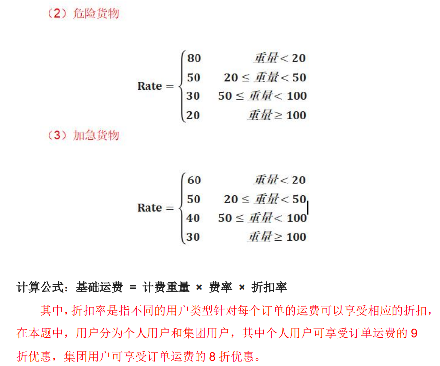 3.两次题目集的最后一题,第一题是考察类设计,重点考核面向对象设计原则中的单一职责原则、里氏代换原则、开闭原则以及合成复用原则,第二次的题目则是针对不同货物费率方面的细化,使得不同的用户类型的每个订单的运费可以享受相应的折扣,跟贴近现实使用。