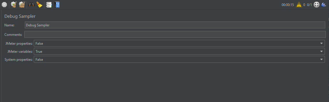 Debug Sample可以查看JMeter properties、JMeter variable、System properties,通常都是用来查看变量值