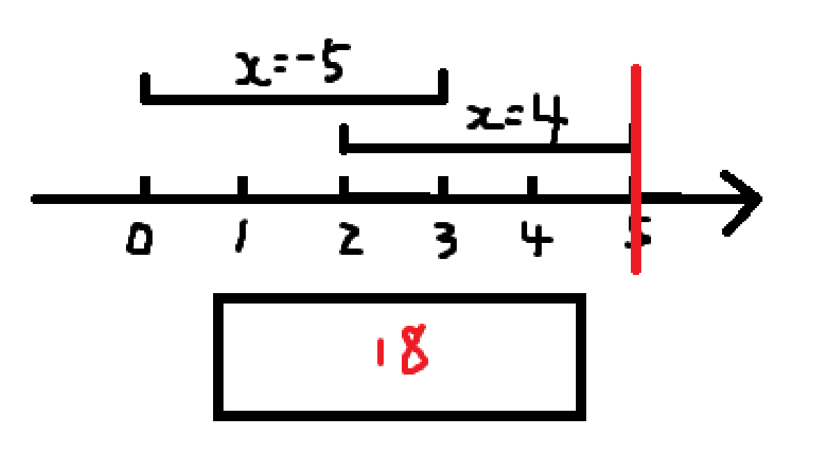 然后扫描线扫到 \(5\),全局加 \(5\),我们发现这个位置是第 \(2\) 个询问的右端点,所以第 \(2\) 个询问的答案就是 \(18\),于是变成这个样子:
