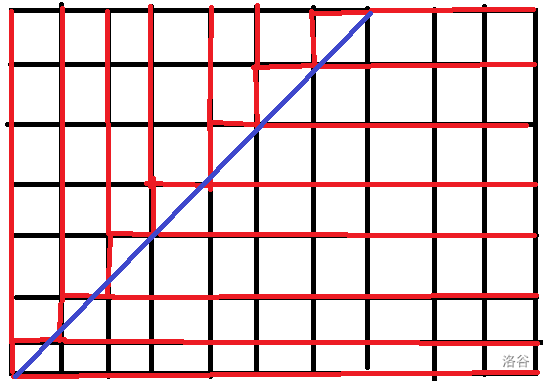 所以我们的最优策略就会如下图红线一样(蓝线代表斜对角)