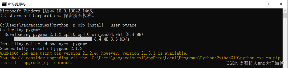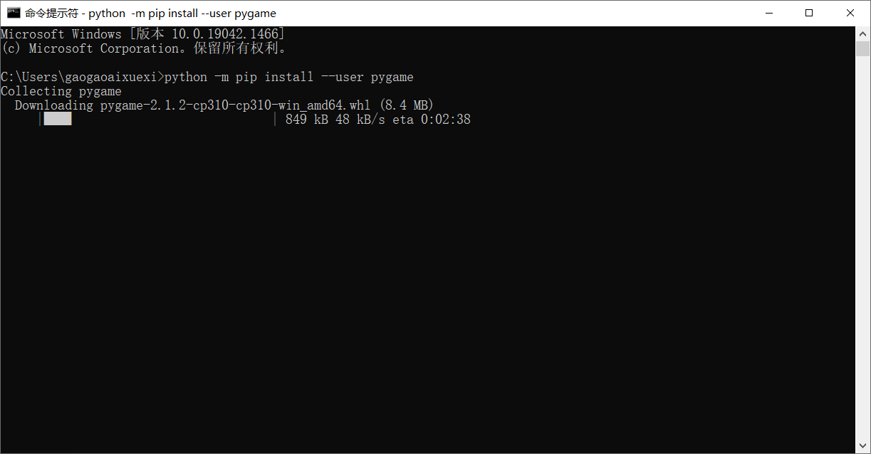 使用pip模块下载并安装Python包。要安装Pygame,在终端提示符下执行如下命令。