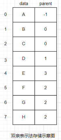 由树的定义可知除了根节点除外每个节点都有且仅有一个双亲结点,根据这一特点,可以用一维结构体数组来存储树的各个节点(一般按层序存储),数组中一个数据元素对应一个节点(节点数等于数组的大小),数组元素包括树中节点的数据信息以及该节点的双亲再该结构体数组中的下标。