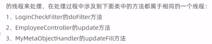 所以可以在LoginCheckFilter中将Session中的当前登陆用户的Id保存到TreadLocal中,再从MyMetaObjectHandler中需要的时候取出来,并且填入实体对象中。