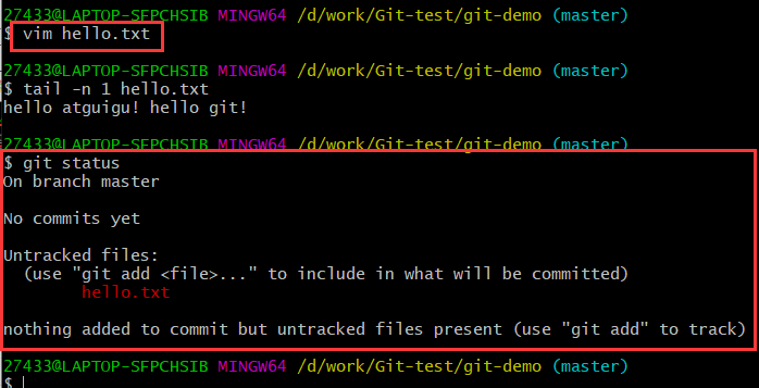 然后我们再查看状态,hello.txt文件名是红色的,且提示存在未跟踪的文件hello.txt,可以使用 git add 跟踪