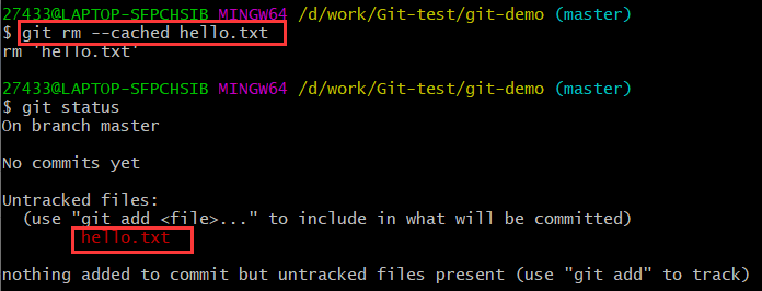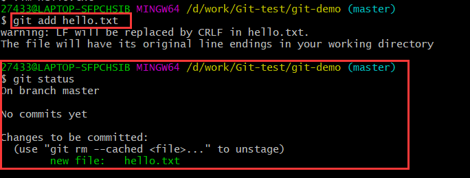 添加了以后,查看状态,发现 hello.txt 文件名变绿了,而且还提示 可以使用git rm --cached 文件名进行暂存区删除