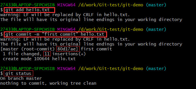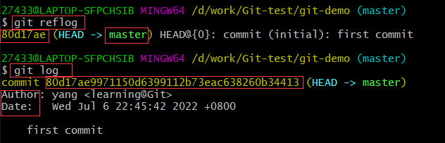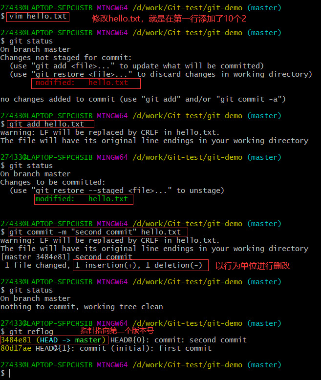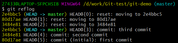重新添加到暂存区,再提交到本地库后,有一个 ' 80d17ae ' 这代表这次提交的版本号,而 11 代表提交的hello.txt文件中有11行内容