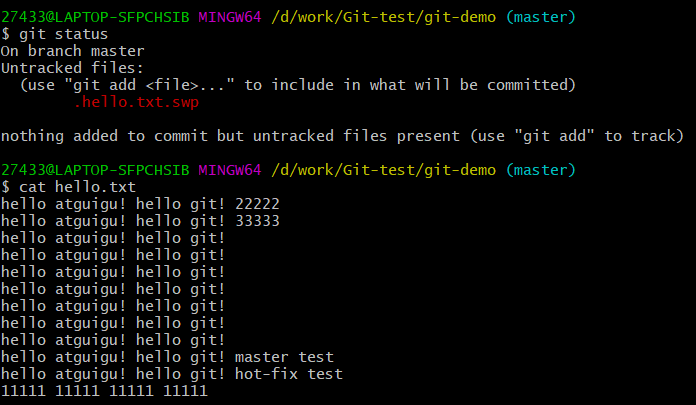内容是hello atguigu! hello git!(重复个11行) ,然后可以使用 yy命令复制整行,使用p命令粘贴到下一行