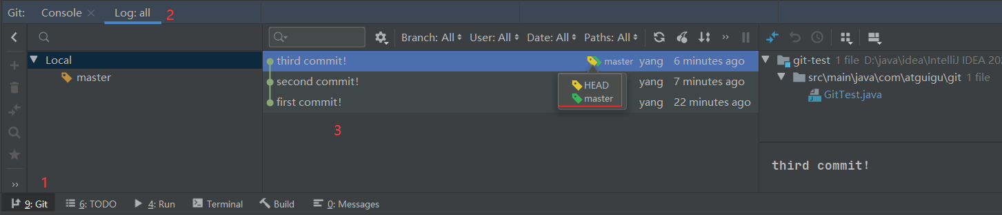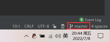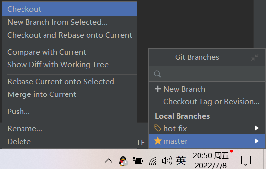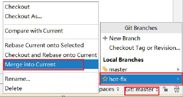 在 IDEA 窗口的右下角,将 hot-fix 分支合并到当前 master 分支。