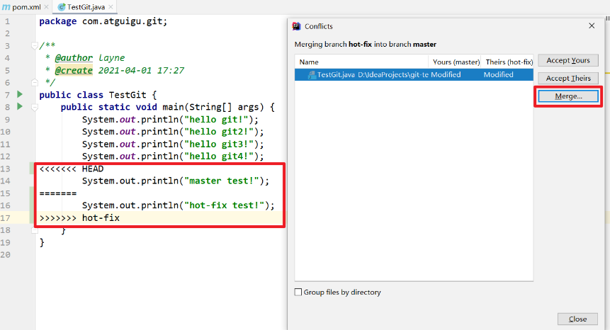 1、如图所示,如果 master 分支和 hot-fix 分支都修改了代码,在合并分支的时候就会发生