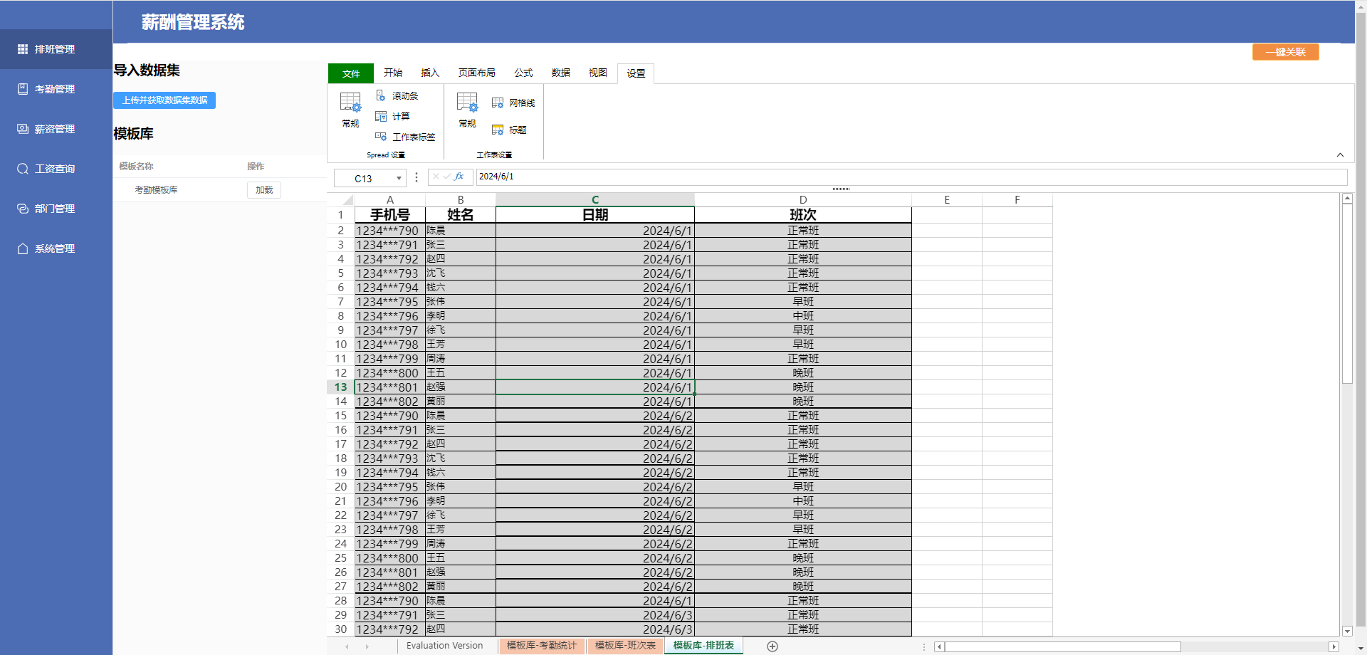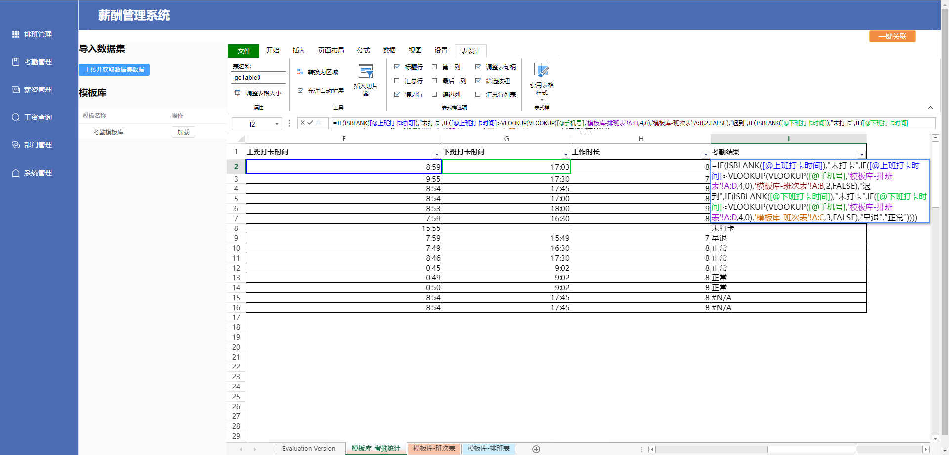 通过SpreadJS的在线表格编辑和计算能力,系统能够自动化的处理考勤数据,并根据既定规则高效计算薪酬,显著提升了数据处理的速度和精确度。SpreadJS提供的公式和函数功能,能够轻松应对复杂的计算场景,如自动识别和计算迟到、早退、加班等情况,以及自动累加和扣除薪酬的各个组织部分。以下是利用SpreadJS构建的在线化排班管理功能。