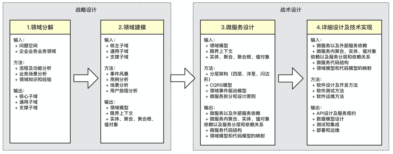 以下是DDD战略设计和战术设计分析流程,及其相关的关键步骤,及每个步骤需要的输入,分析方法,输出的关键成果物。