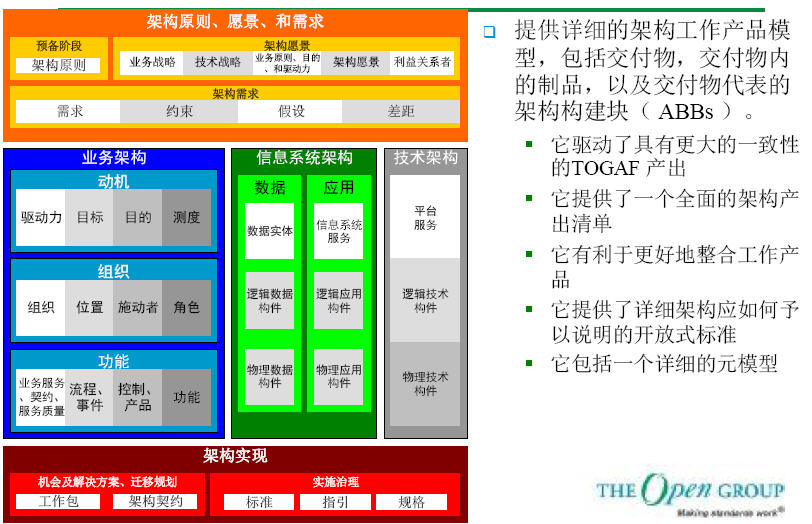 TOGAF标准是The Open Group标准之一,企业架构标准,TOGAF为标准、方法论和企业架构专业人士之间的沟通提供一致性保障。