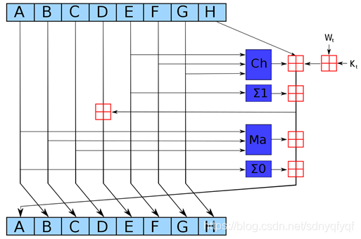 d) 迭代。进行64次加密循环即可完成一次迭代。加密过程如图4所示:ABCDEFGH这8个字最开始分别是8个哈希初值,之后按照图示规则进行更新;深蓝色方块是事先定义好的非线性逻辑函数;红色方块代表加法(若结果大于232,则进行一次mod 232运算);Kt为SHA-256常量,Wt为本区块产生第t个word,0≤t<64;最后一次循环所产生的八段字符串合起来即是此区块对应到的散列字符串;