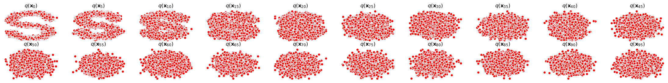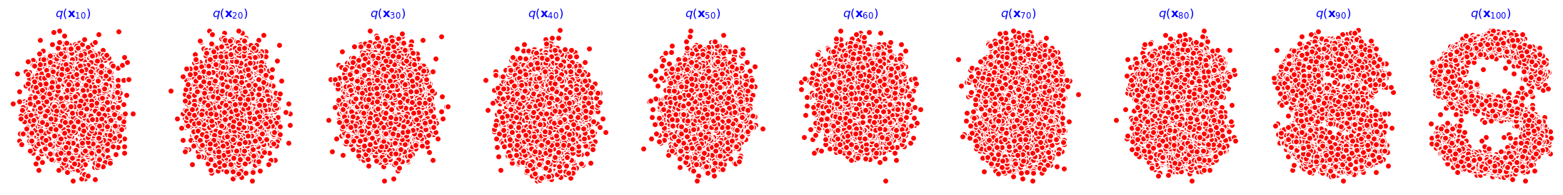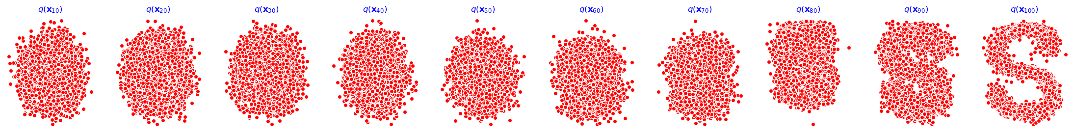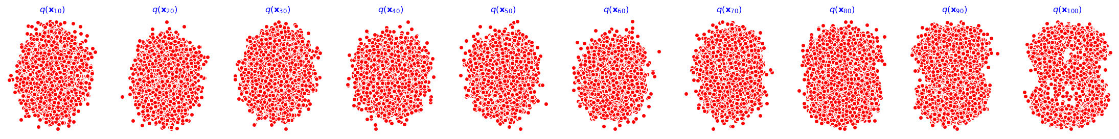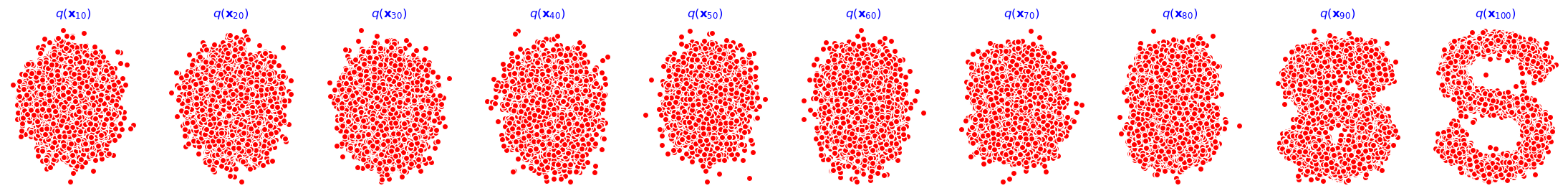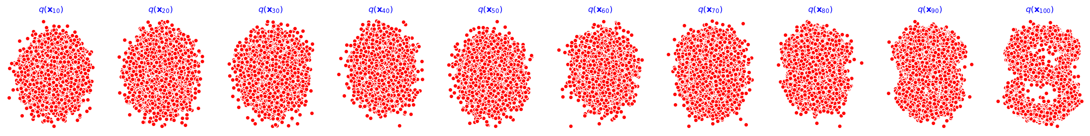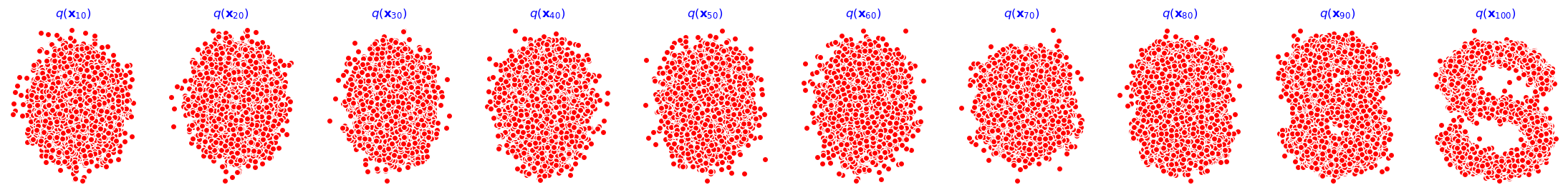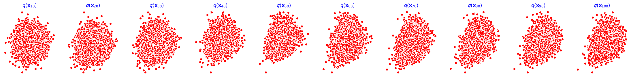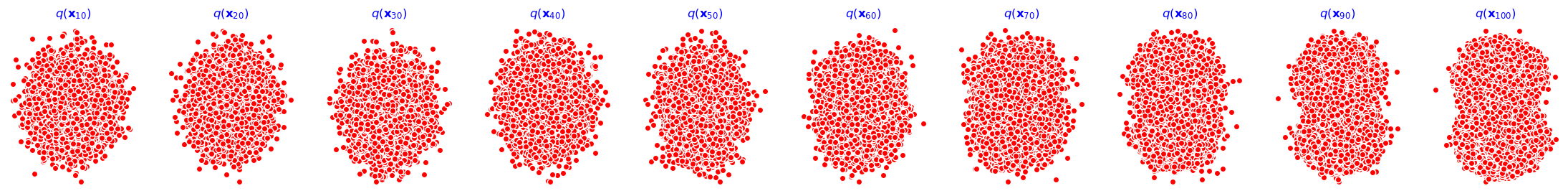 axs[j, k].set_title('$q(\mathbf{x}_{'+ str(i * num_steps//num_shows) +'})$')