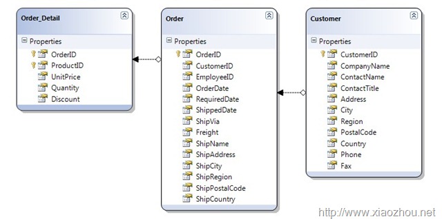 LinqTestDataContext ctx = new LinqTestDataContext(); ctx.Log = Console.Out; DataLoadOptions dl = new DataLoadOptions(); dl.LoadWith<order>(p => p.Customer); dl.LoadWith<order>(p => p.Order_Details); ctx.LoadOptions = dl; var result = ctx.Orders.Where(p => p.OrderID == 10251).ToList(); foreach (var t in result) { Console.WriteLine("OrderID:" + t.OrderID + "-OrderDate:" + t.OrderDate.Value.ToString("yyyy-MM-dd") +"-CustomerName:" + t.Customer.ContactName); foreach(var m in t.Order_Details) Console.WriteLine("ProductID:" + m.ProductID + "-Price:" + m.UnitPrice + "-Amount:" + m.Quantity); } |