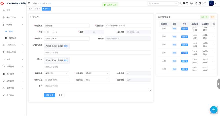 门诊挂号界面,收费处人员可以通过填写必要信息,给患者进行挂号操作。