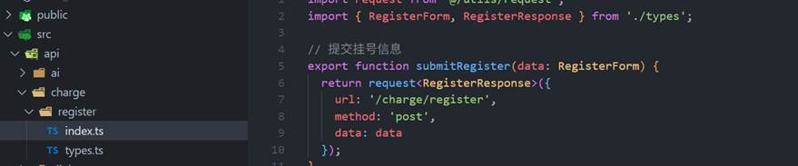 上图为系统前端的接口设计,以门诊收费接口为例,这里对其业务结构进行了统一的封装,收费处所用到的所有接口统一写在api目录的相应index.ts文件中。每个接口中均定义了请求后端的链接、请求方式、请求参数,对于一些请求和响应的参数均定义在types.ts中,并且在index.ts中引用。