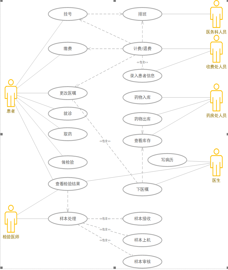 医生是本系统主要业务的用例图。各个角色的功能已经在功能结构图中表述清楚,下面将主要描述一下功能与功能之间的联系,并且为了简洁,省略了信息查询功能。