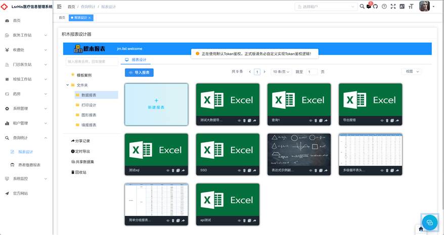 医院中很多数据的展示均使用报表的形式,因此这一块是非常重要的,在开发过程中,尝试了很多种报表工具去展示数据,通过给挂菜单的方式将表格、图表等方式的数据展示给用户。这些操作很多的报表工具均能达到,但是如何很方便、快捷的个性化设计报表呢?总不能医院需要报表的均由系统开发人员开发,这样将会导致成本非常大,所以引入一个医院信息科人员方便维护的报表工具是必要的,兼顾简单、功能丰富、扩展性强。由此试用了很多的工具,最终选用积木报表,开源、简单、功能强大,非常适合这样的环境,去让医院自己的人员去个性化设置报表,让医生可以更加方便获取到各种数据的统计结果,也可以节省系统开发人员的时间和资源。